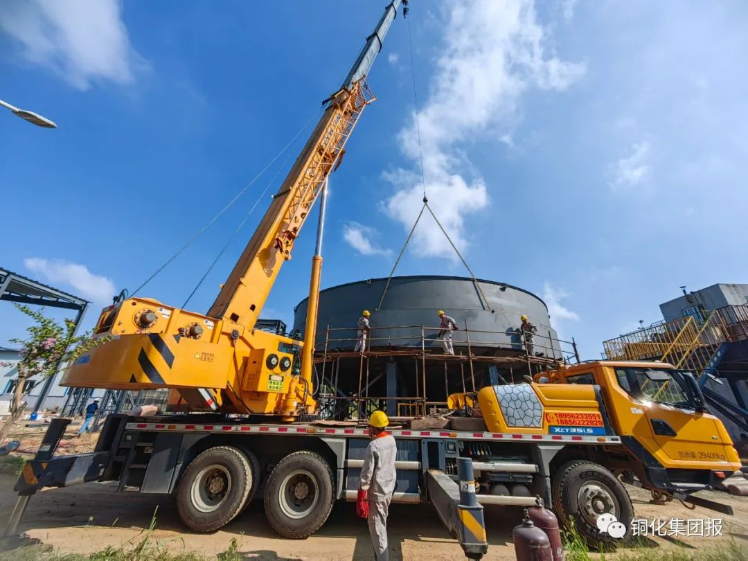 項(xiàng)目完工投用后,每年可處理選礦廢水247.5萬立方米、酸性廢水1000萬立方米,去除COD1485噸、硫化物146.03噸、重金屬錳208噸,在保障原生產(chǎn)線正常運(yùn)行的同時(shí),顯著降低相關(guān)污染物排放,實(shí)現(xiàn)外排水水質(zhì)穩(wěn)定達(dá)標(biāo),有效保護(hù)當(dāng)?shù)厮h(huán)境,環(huán)境效益和社會(huì)效益顯著。上圖為吊裝作業(yè)現(xiàn)場(chǎng)。