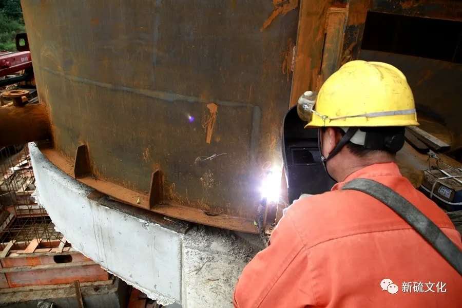 已近正午12點,龐然大物終于平穩(wěn)“落座”,我便收工吃飯,但是高臺上更為緊張的忙碌仿佛剛剛拉開戰(zhàn)幕。接近1點,在高臺上草草用過盒飯的好“焊”們已經(jīng)完成了浮選機槽體與底座的調(diào)試、找平,開始焊接底座。由于槽體緊貼底座地面,好“焊”賀家斌干脆睡倒在地作業(yè),可即使采用這種罕見的“臥式”焊接,槽體底部的幾處邊邊角角還是無法焊接到,眉頭擠成了“川”字的賀家斌來回調(diào)整“睡姿”都不理想,恨不得立即將地面掏出一個洞,人降到洞內(nèi)焊接——突然他靈機一動,將筆直的電焊條擰成彎曲狀,利用焊條弧度完成了邊角處的焊接。